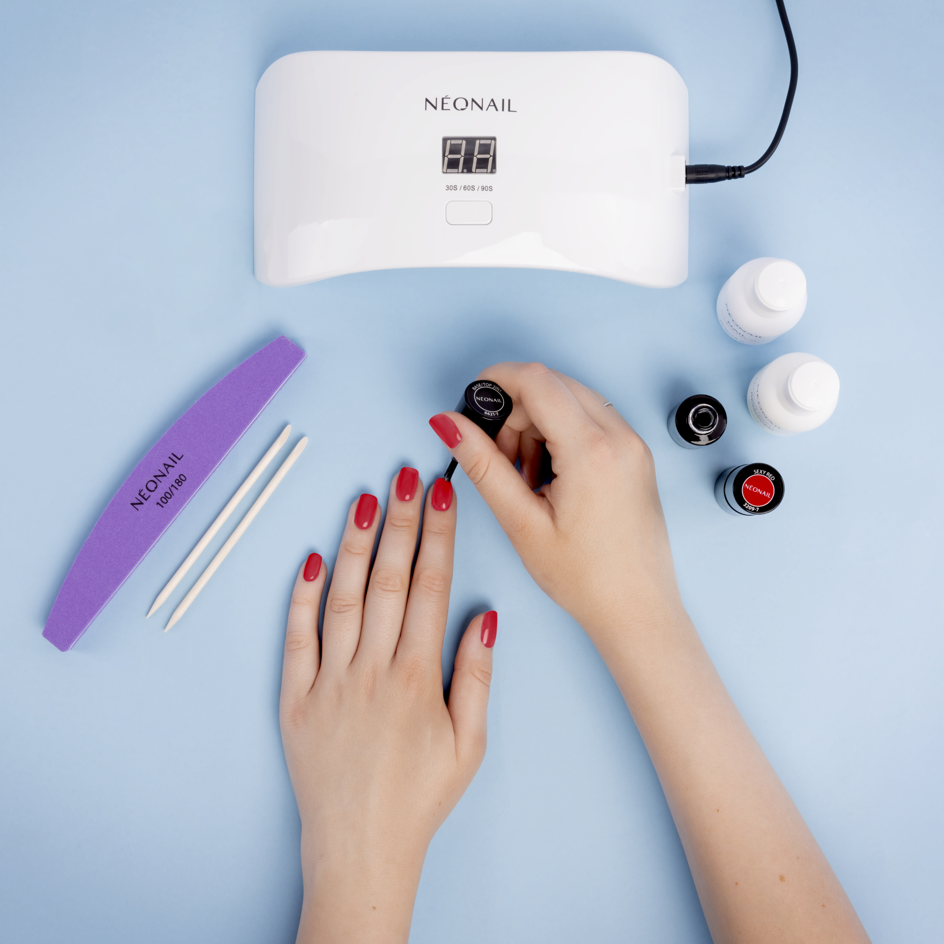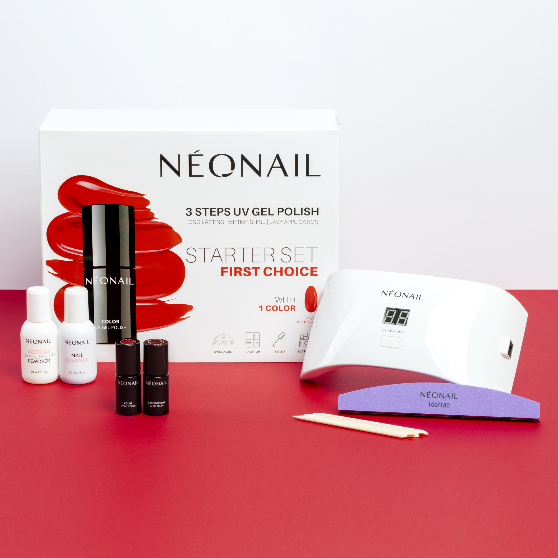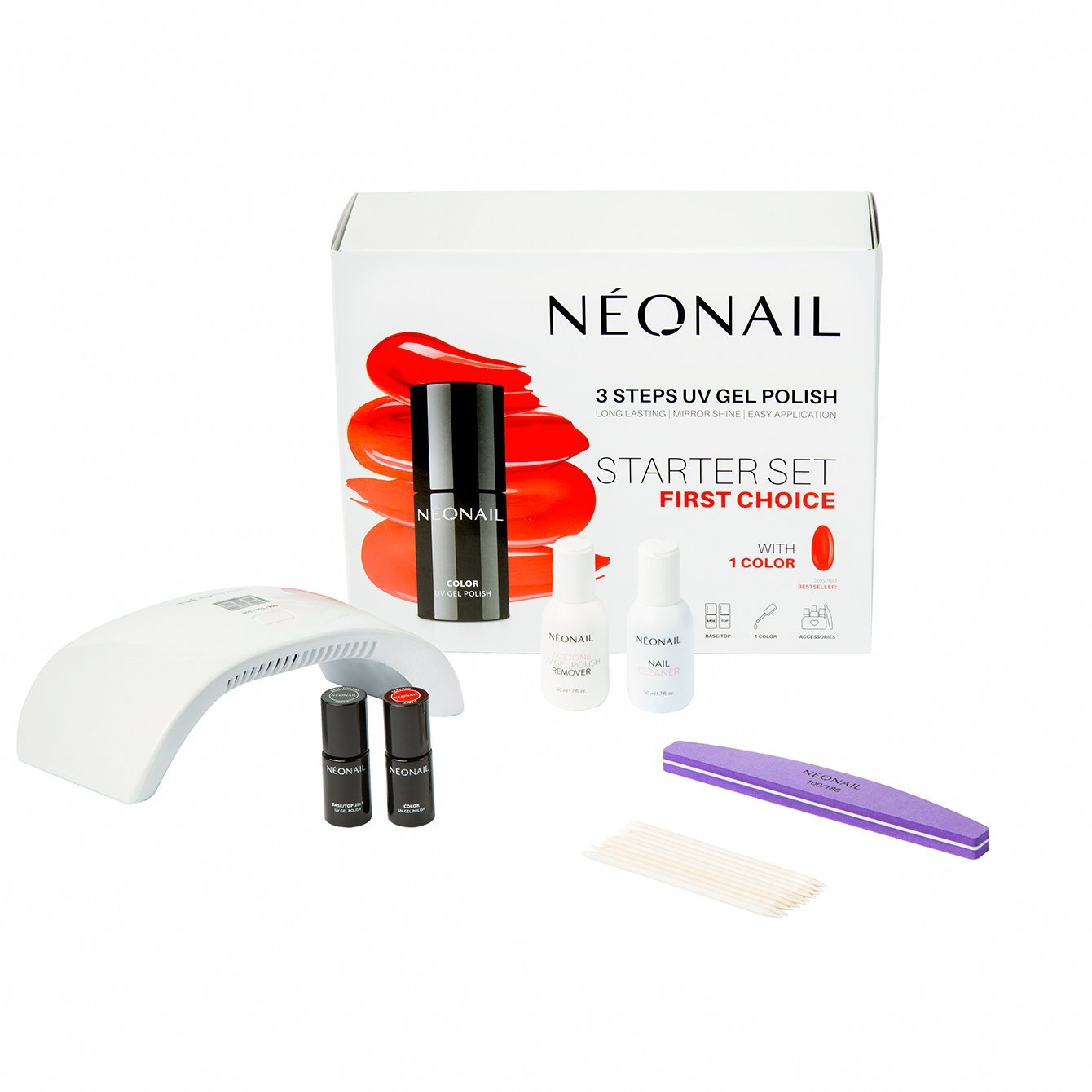 NÉONAIL Starter Set First Choice - €40,70 Met de NÉONAIL Starter Set First Choice kan er gemakkelijk een gellak manicure aangebracht worden. De set bevat één gellak kleur: Sexy Red, een van de bestsellers. Daarmee is de First Choice Starter Set perfect om mee te beginnen, waarna de collectie NÉONAIL gellak kleuren kan worden uitgebreid met de verschillende seizoen collecties. De Base/Top 2in1 is een base- en topcoat in één flesje. Deze kan zowel onder als boven de gellak gebruikt worden. De compacte LED lamp en accessoires maken de starter set compleet. De set bevat: