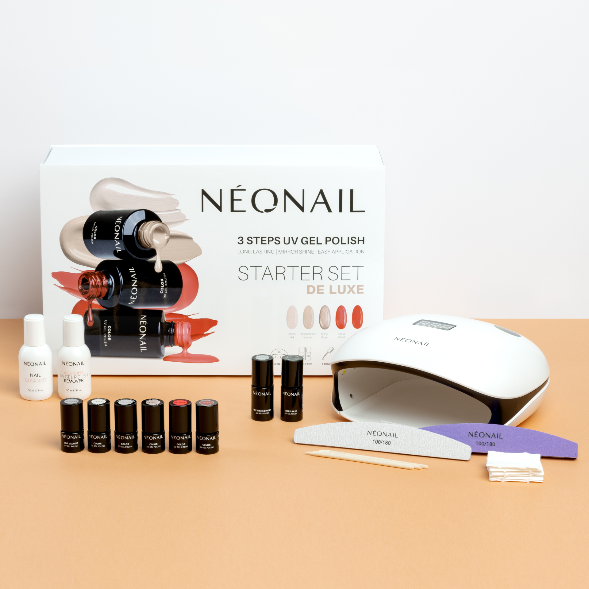 De manicure begint met een Starter Set: een complete set met alle tools om thuis zelf aan de slag te gaan. De collectie kleuren kan worden uitgebreid met losse NÉONAIL gellak kleuren die apart verkrijgbaar zijn.