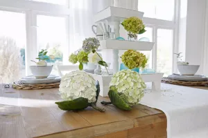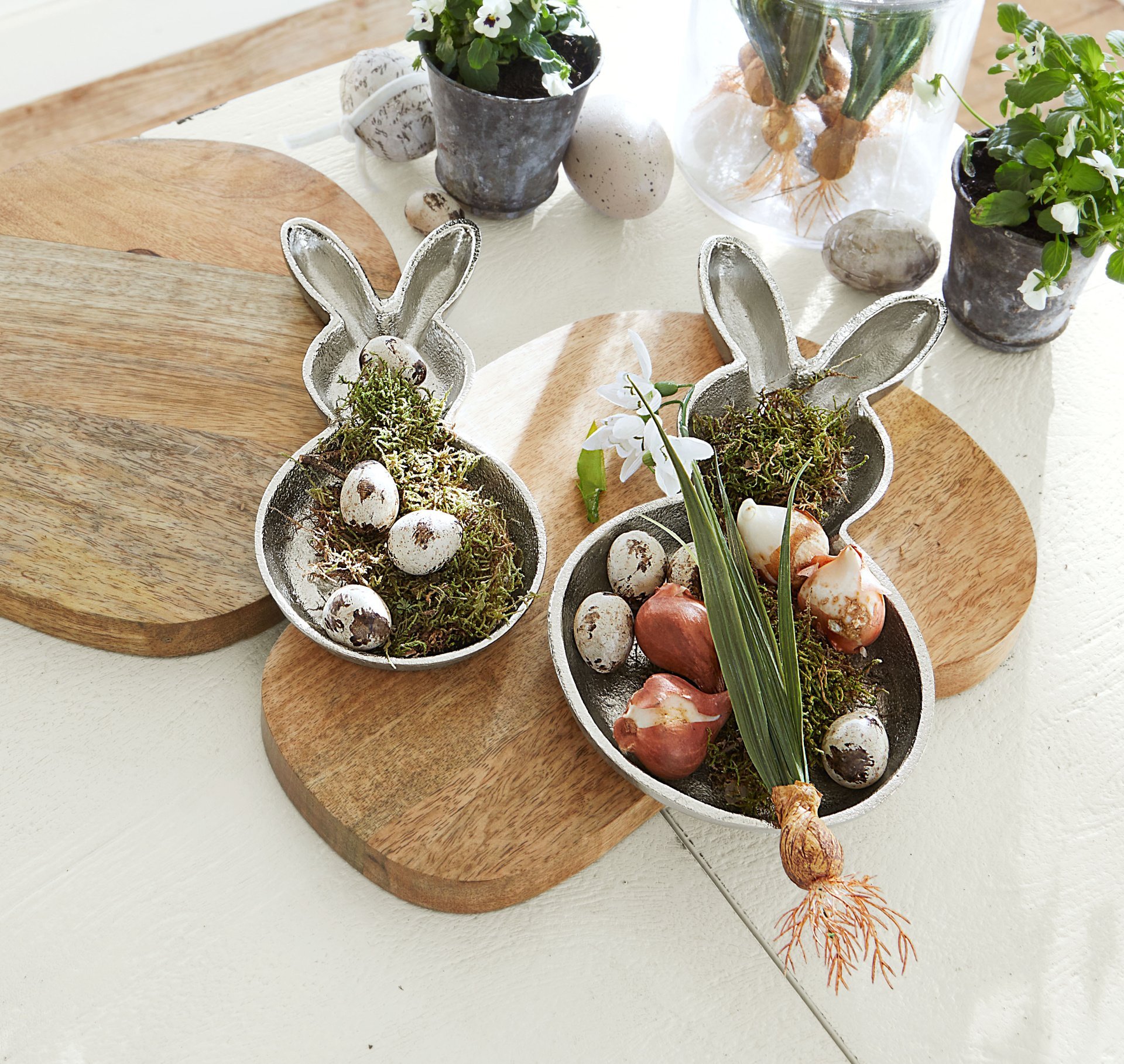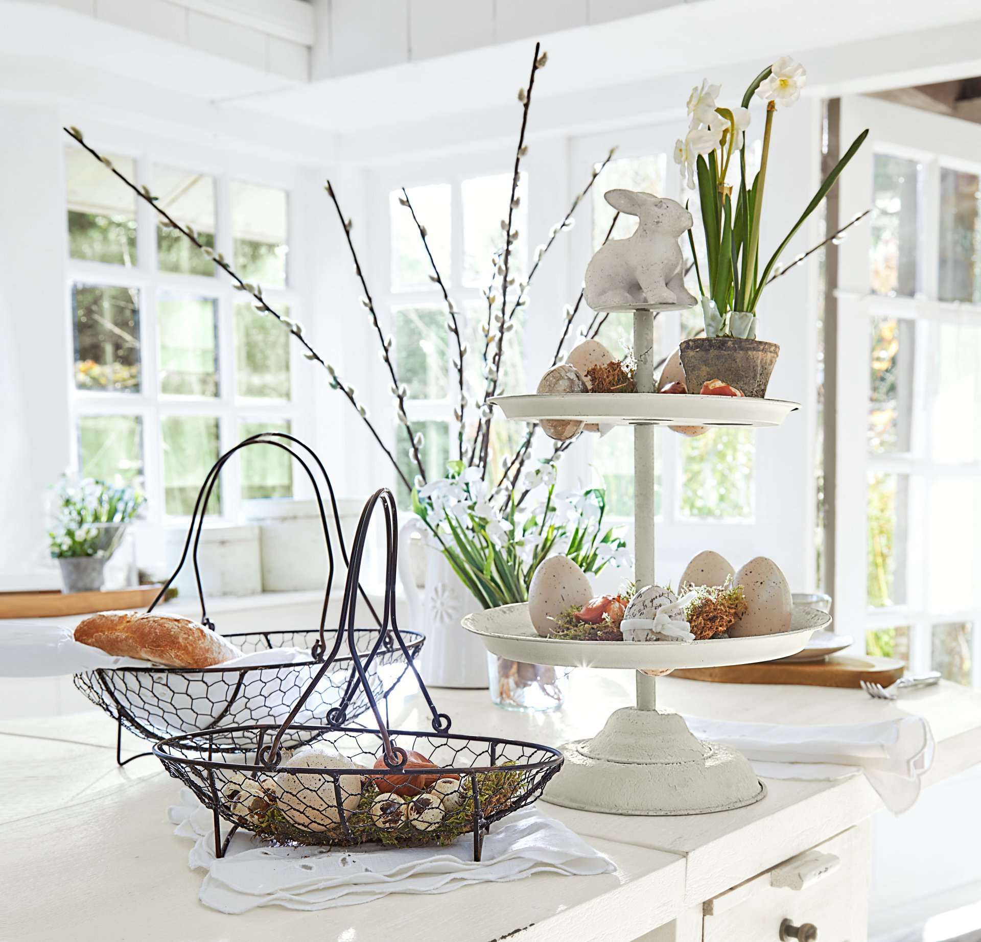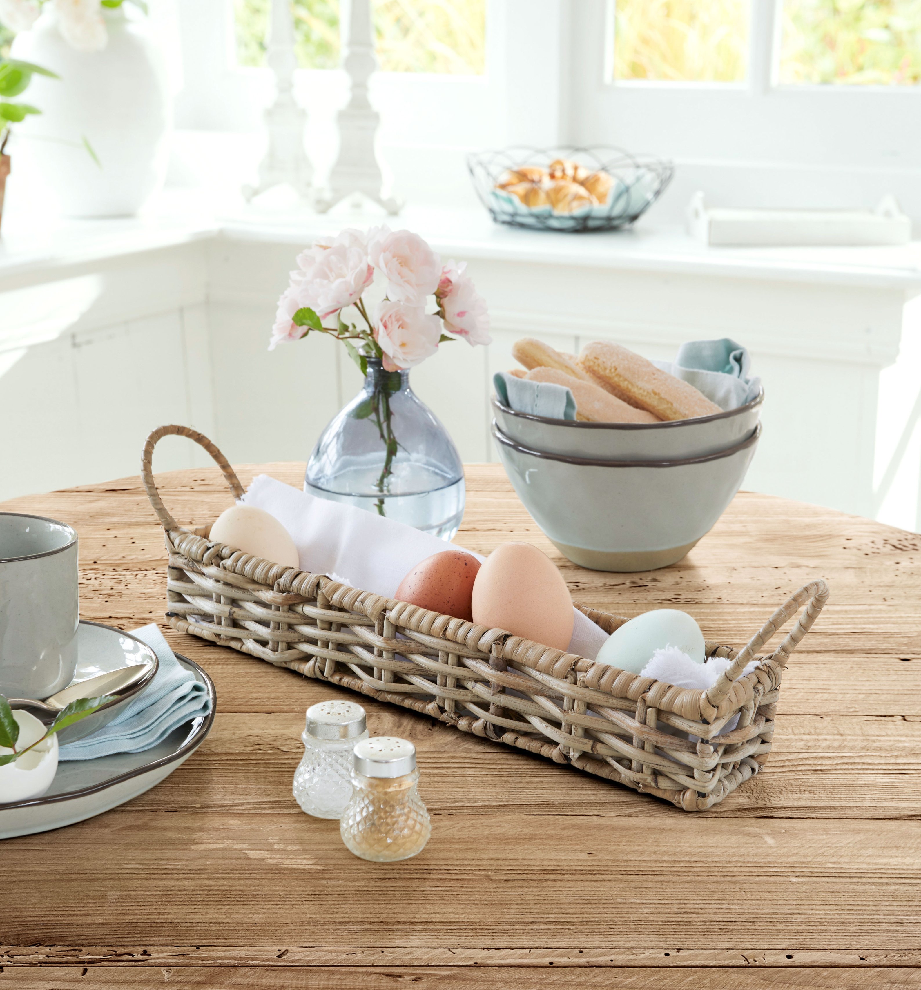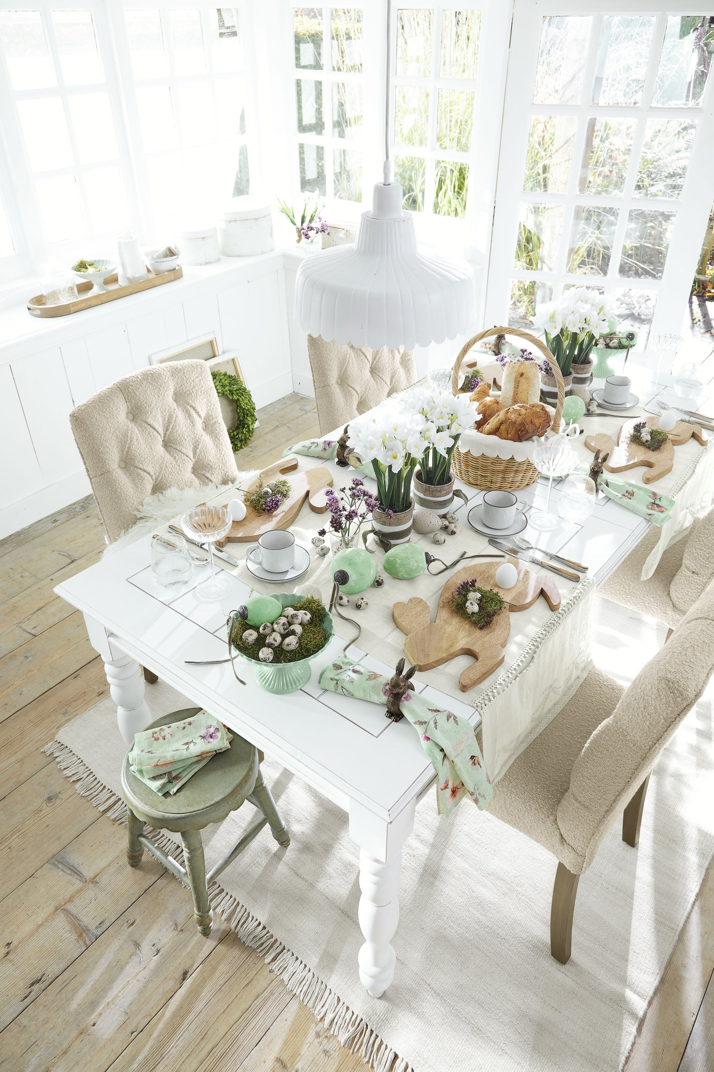 De collectie brengt het frisse lentegevoel tot leven met zachte witte en pastelkleuren. Van elegante decoraties zoals paasboeketten tot verfijnde tafelaccessoires als rieten broodmandjes – alles voor een gedekte tafel die zowel fris als kleurrijk oogt.